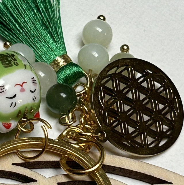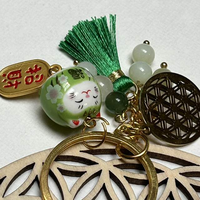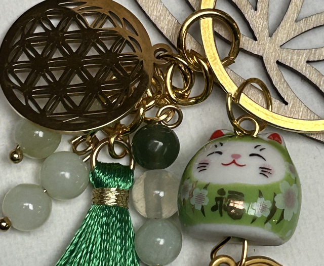 Porte clé doré avec chat chinois de couleur vert et pierre de jade