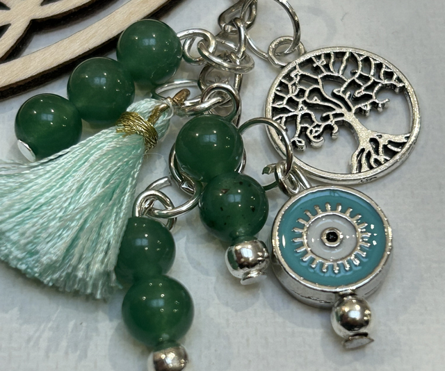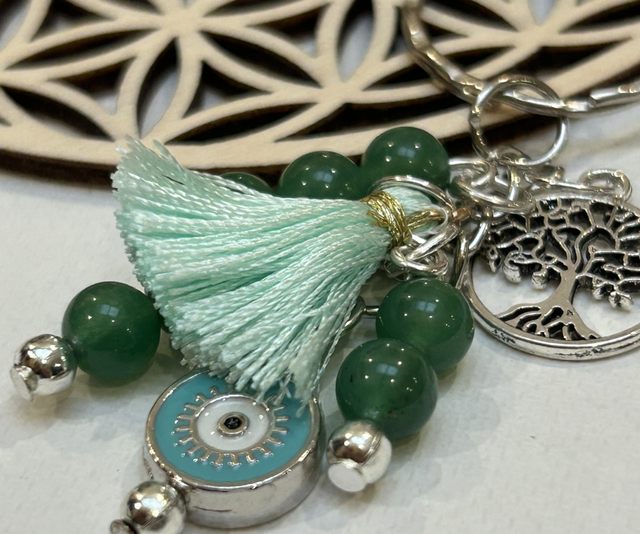 Porte clé en métal avec œil vert clair voir turquoise avec arbre de vie et pompom vert et surtout 7 pierres de 6 mm d aventurine