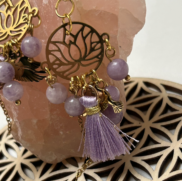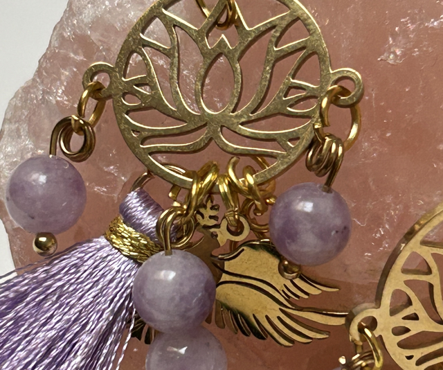 Boucle d’oreille avec lepidolite de 6 mm fleur de lotus et colombe