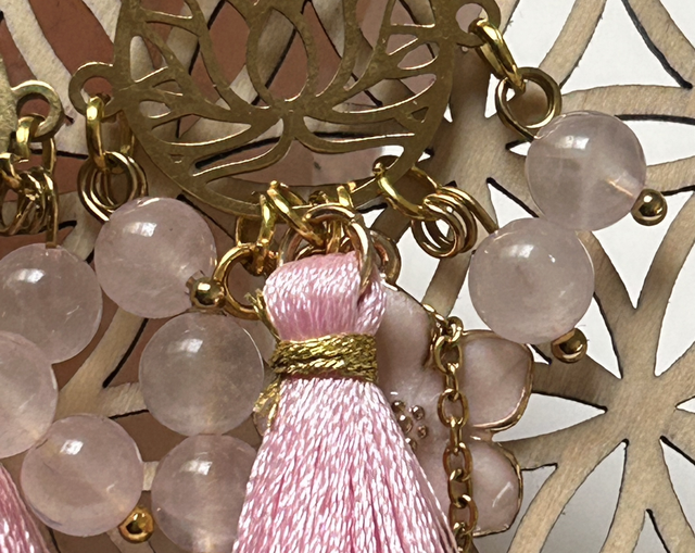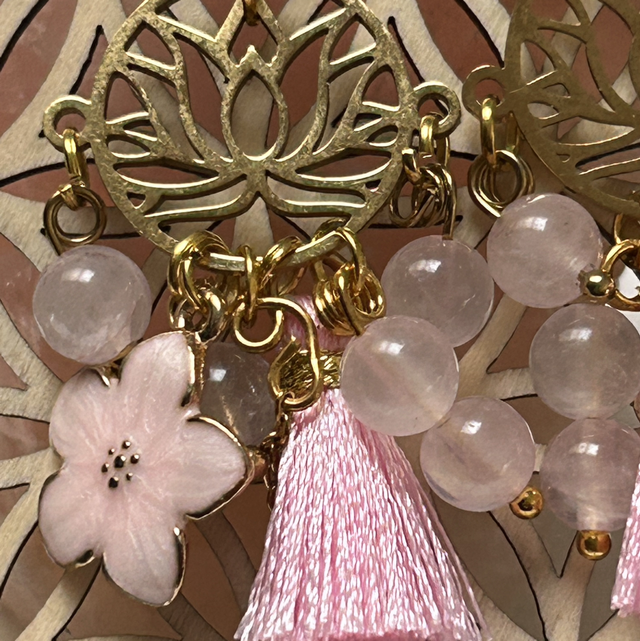 Boucle d’oreille avec quartz rose de 6 mm et fleur rose et pompom rose